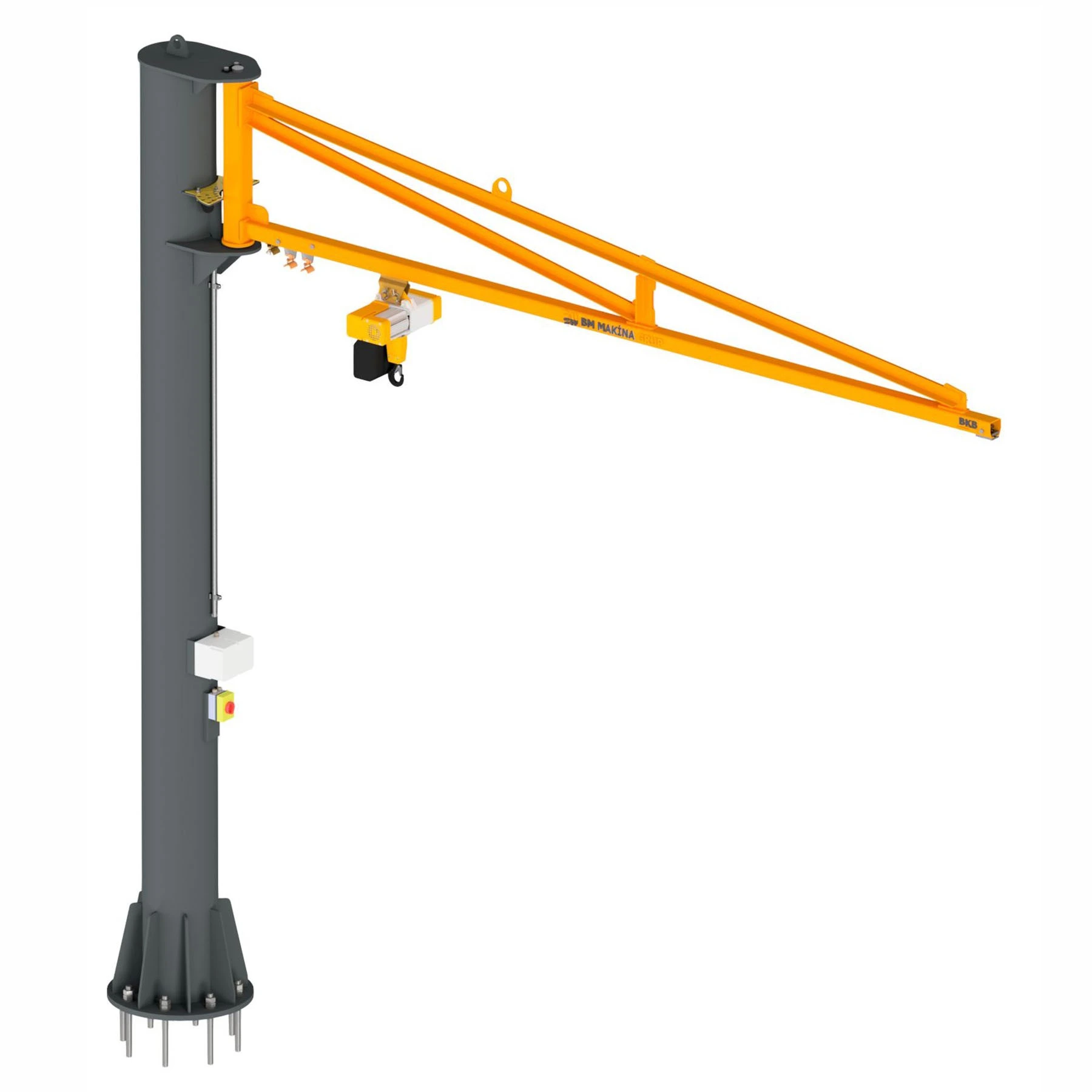 BKB / ALUBKB Ayaklı Pergel Vinçler, BM Makina’nın BKB / ALUBKB hafif vinç sistemleri ailesine ait, kolonu zemine ankrajlı, yatay döner kol yapısına sahip, elektrikli zincirli vinç ile donatılmış kompakt kaldırma çözümüdür.