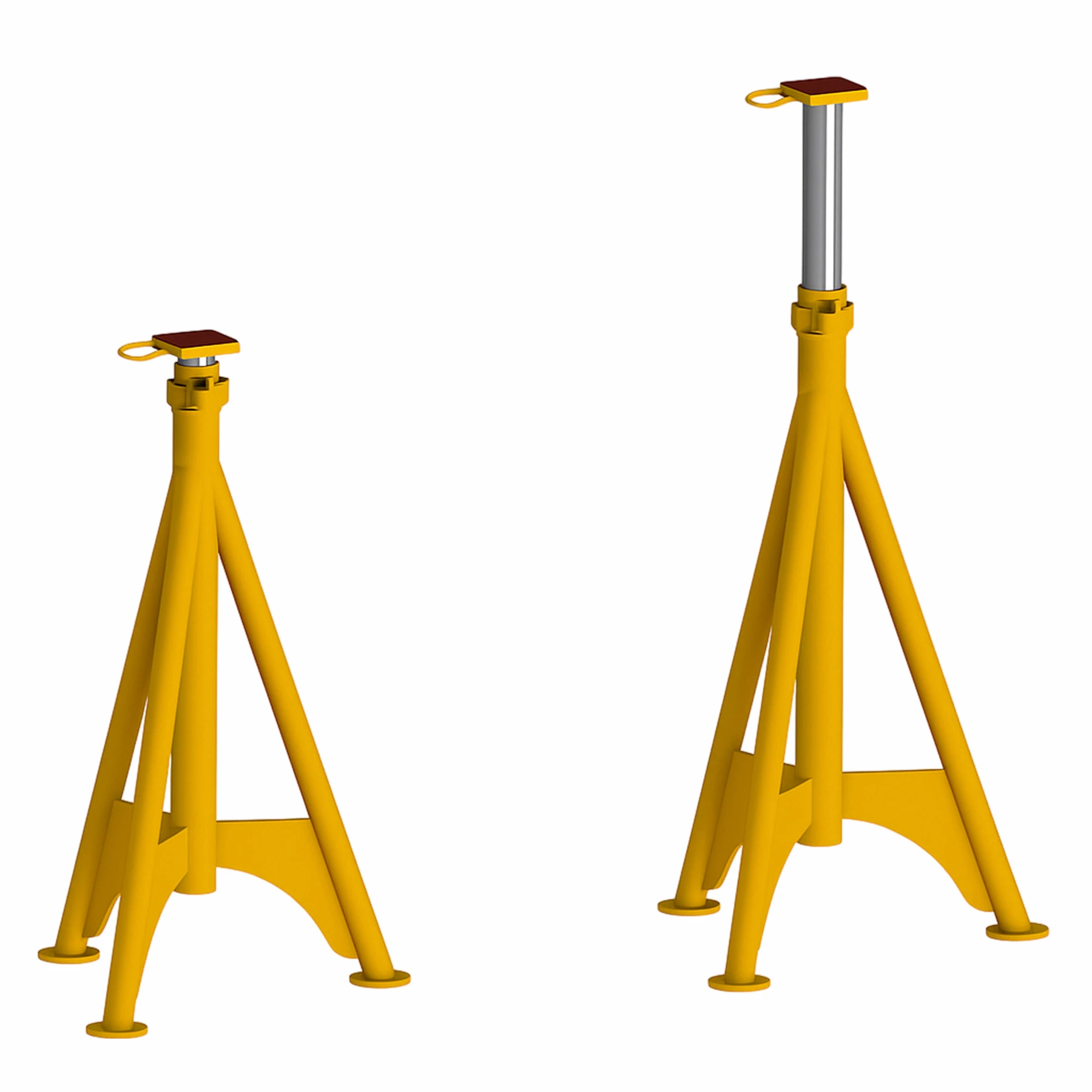 Yük dağılımı, sehpa tabanındaki geniş ayak geometrisi sayesinde dengeli şekilde yapılır; kaymaz taban yapısı ve mekanik kilitleme sistemiyle stabil ve emniyetli bir destek oluşturur.